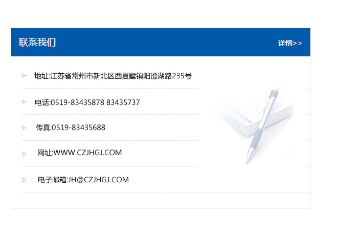 地址:常州市新北區友邦商務大廈1幢16、17層  電話:0519-85101652  傳真:0519-85112595  郵編:213022  網址:www_cz-jiayue_cn.jiulingwan.com  郵箱:xiajifengaa@163.com